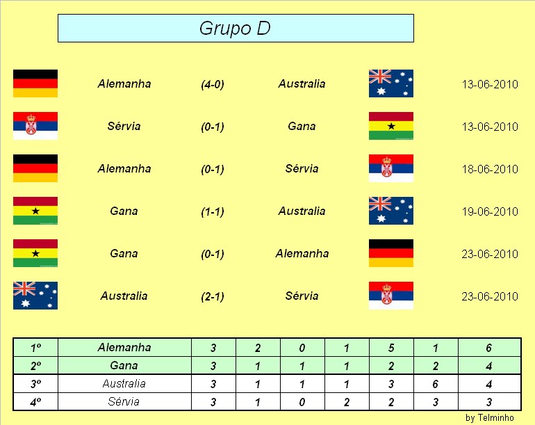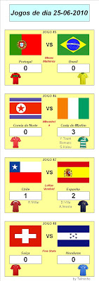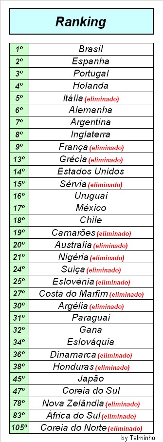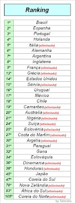 Brasil: Naturalmente primeiro Portugal: Contra muitos maus linguas passou com alguma distinção Costa do Marfim: Fez o seu trabalho Coreia do Norte: Ainda surpreendeu na estreia,nada mais