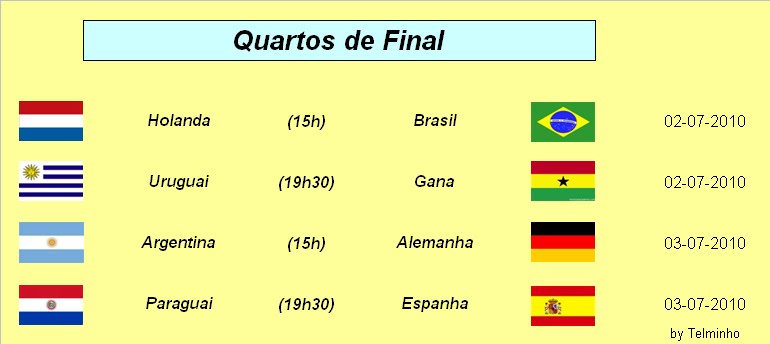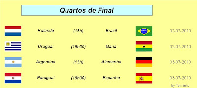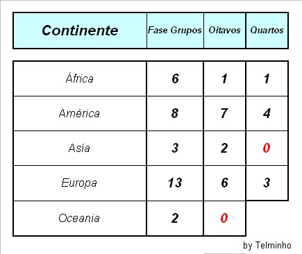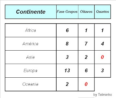 Surpresas: O continente Africano continua a sonhar com uma equipe,Gana e a America do Sul com 4 equipes nas 8 melhores deste Mundial... Desilusões: O continente Europeu esta a perder folego a nivel mundial...