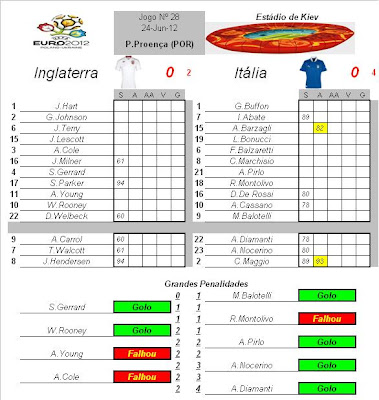 Itália - poderá dizer-se que...depois de quase abandonarem a competição na semana antes do inicio...a Itália é a pequena surpresa a chegar as meias finais...esta equipa conta muito com a experiencia dos grande nomes italianos ainda no activo...e tambem com a boa cultura tactica do seu treinador que tem montado a sua equipa de maneira a levar "água ao seu moinho"...frente a Inglaterra o prolongamento e as grandes penalidades foram um castigo para eles devido ao jogo em si terem sido bem superiores...mas a mestria de A.Pirlo na marcação da grande penalidade "à Panenka" e a calsse de G.Buffon entre os postes levaram a Itália a passar mais um obstaculo e chegar as meias finais...