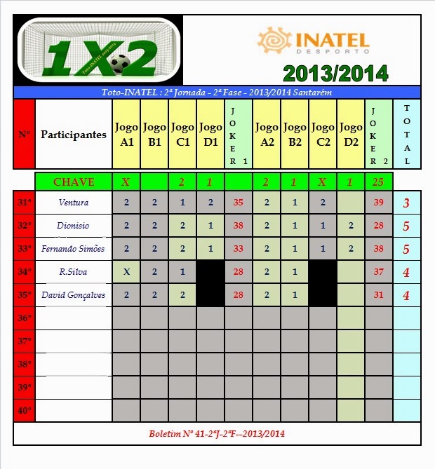 AVISO: Por já haver muitas apostas efetuadas, o jogo D2 não contará para o Toto-INATEL nesta jornada devido a troca de quem joga em casa, jogo certo seria Errense vs Malhada Alta (e não Malhada Alta vs Errense), mas no entanto o Joker 2 continua com os jogos todos normal..